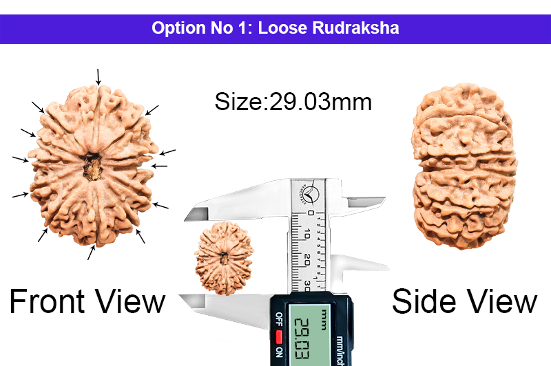 The 12 Mukhi Rudraksha bestows the inmates with immense dignity, respect, name and fame. This Rudraksha has a miraculous quality of extreme protection bestowed on the devotee and gives happiness and material gains and protection from sudden death and accidents. The Ruling Planet of 12 Mukhi Rudrakshas is Sun and it removes negativity, brings peace and the auspicious environment in the house and the workplace and protects the inmates from sudden accidents and thefts. It is also very good for the longevity of the inmates and controls Headache, Heart Disease, Skin Disease, Hiatus of Stomach and other related Problems. 12 Mukhi Rudraksha should be worn with 1 Mukhi, 3 Mukhi, 10 Mukhi, 14 Mukhi and 17 Mukhi Rudraksha to attain Dhyan yoga and Salvation and taking the business fame at the highest heights. This rudraksha balances Vishude, Manipurka and Swadisthana.
