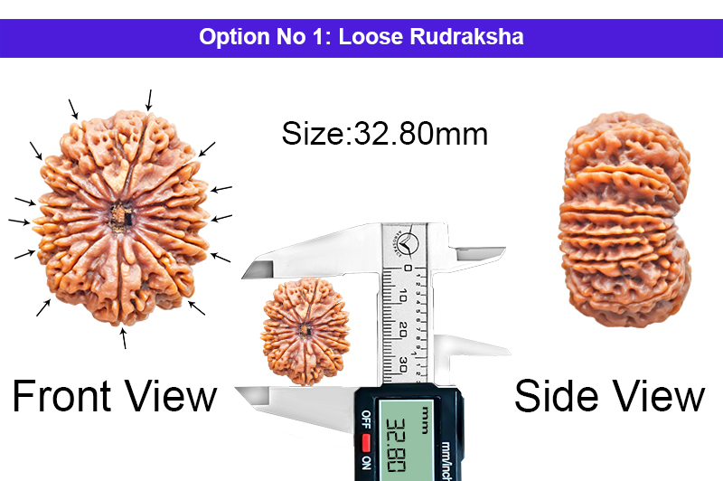 13 Mukhi Rudraksha is Lord Indra and Lord Kamadeva Rudraksha and controls the planet, Venus. The God of love Lord Kuber not only gives the wearer immense strength and vigour but also fulfils all worldly desires of the devotee. This Rudraksha gives immense attraction, high confidence levels, strong determination, extra-strong will power and blesses him with immense success. He excelled and succeed in toughest endeavours and challenges which other competitors do not venture into and emerge out to be victorious. 13 Mukhi Lord Indra Rudraksha gives riches, honour, dignity, respect, accomplishments and fulfils all the earthly desires. This 13 Mukhi Kamdev Rudraksha gives hypnotic power of attraction (Vashikaran) to the wearer which makes the wearer in getting praises from all levels and the wearer rises to the topmost position in any field. Apart from this rudraksha is extremely helpful in doing meditation, astral travel, cosmic, spiritual and transcendence attainments. Normally the mantra of this Maha Rudraksha is pronounced wrong.