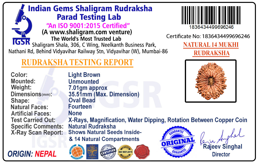 This 14 Mukhi Rudraksha bead is extremely good for meditation and astral travel. There is a misconception, that school-going children cannot wear 14 Mukhi Rudraksha, which is not correct. Several experiments conducted on high IQ, medium IQ and low IQ children by Shaligram.com has clearly indicated that students have jumped to higher IQ after wearing of 14 Mukhi Rudraksha for around 40 days. Therefore Shaligram.com strongly recommends the 14 Mukhi Rudrakshas for the students for all the age group and especially who wants to excel in studies. The 14 Mukhi Rudraksha is strongly recommended to be worn on the chest, forehead or right arm. This Rudraksha along with Golden Shivalinga Shaligram and 12 Mukhi, 13 Mukhi and 15 Mukhi if kept at North East or East direction brings very strong intuitive strength to the devotee. Immense prosperity, extreme protection and peaceful environment prevails in the devotee house and the workplace who wears 14 Mukhi Rudraksha.