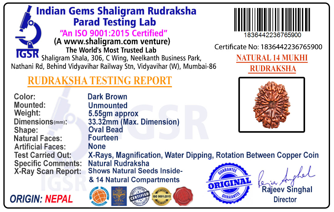 This 14 Mukhi Rudraksha bead is extremely good for meditation and astral travel. There is a misconception, that school-going children cannot wear 14 Mukhi Rudraksha, which is not correct. Several experiments conducted on high IQ, medium IQ and low IQ children by Shaligram.com has clearly indicated that students have jumped to higher IQ after wearing of 14 Mukhi Rudraksha for around 40 days. Therefore Shaligram.com strongly recommends the 14 Mukhi Rudrakshas for the students for all the age group and especially who wants to excel in studies. The 14 Mukhi Rudraksha is strongly recommended to be worn on the chest, forehead or right arm. This Rudraksha along with Golden Shivalinga Shaligram and 12 Mukhi, 13 Mukhi and 15 Mukhi if kept at North East or East direction brings very strong intuitive strength to the devotee. Immense prosperity, extreme protection and peaceful environment prevails in the devotee house and the workplace who wears 14 Mukhi Rudraksha.