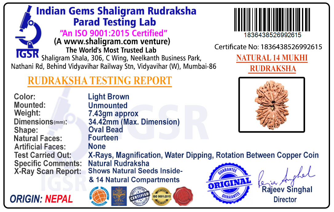 This 14 Mukhi Rudraksha bead is extremely good for meditation and astral travel. There is a misconception, that school-going children cannot wear 14 Mukhi Rudraksha, which is not correct. Several experiments conducted on high IQ, medium IQ and low IQ children by Shaligram.com has clearly indicated that students have jumped to higher IQ after wearing of 14 Mukhi Rudraksha for around 40 days. Therefore Shaligram.com strongly recommends the 14 Mukhi Rudrakshas for the students for all the age group and especially who wants to excel in studies. The 14 Mukhi Rudraksha is strongly recommended to be worn on the chest, forehead or right arm. This Rudraksha along with Golden Shivalinga Shaligram and 12 Mukhi, 13 Mukhi and 15 Mukhi if kept at North East or East direction brings very strong intuitive strength to the devotee. Immense prosperity, extreme protection and peaceful environment prevails in the devotee house and the workplace who wears 14 Mukhi Rudraksha.