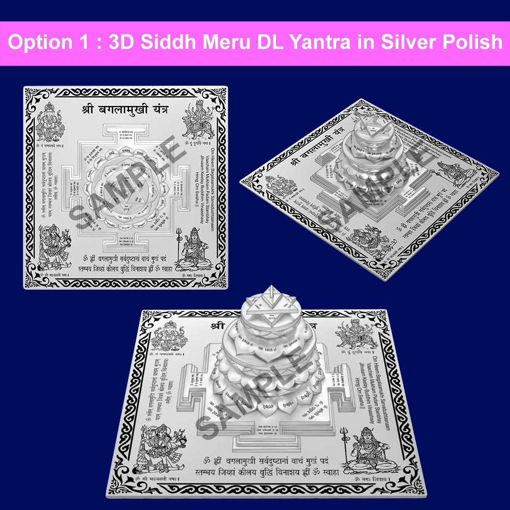 Powerful Maha Siddh Meru Baglamukhi Yantra on Lotus in Silver Polish is elegantly crafted in an elevated 3-dimensional shape on Bhupura (base) which is made of Ashtadhatu. This Baglamukhi Yantra is designed according to the genuine historical texts. It features the correct geometry of the steps leading to the focal point where the soul of an individual converges with the creative energy of Mata Baglamukhi. The step begins with a square base leading to a sixteen petal lotus followed by smaller petal lotus ascending to a circle and an eight petal lotus accompanied with the aid of the circle and 3 inverted triangles leading to the middle point. The yantra products are delivered to the customers after proper energization & pran pratishtha. Therefore all the devotees are requested to forward their date, time & place of birth while ordering Baglamukhi Yantra, so that the proper energization & pran pratishtha could be done on their names before the dispatch of the product.