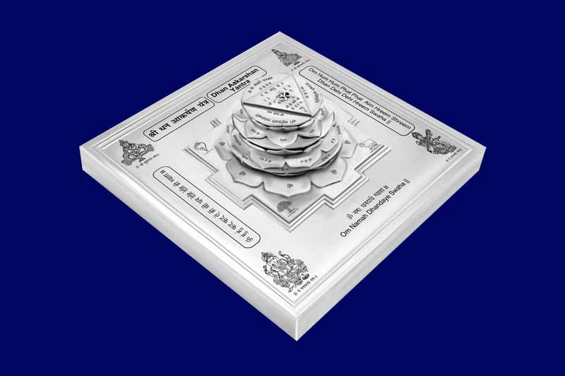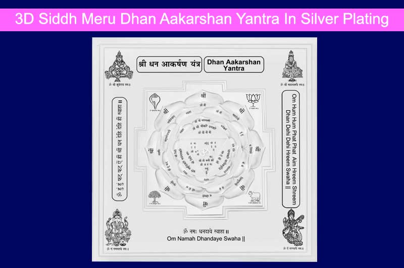 The 3D Siddh Meru Dhan Akarshan Yantra on Double Lotus is made of ashtadhatu with silver plating. The phrase akarshan means to attract, so this Yantra is to often attract wealth and abundance. The Yantra is a device that enables to energise the location where it is placed. The Siddh Meru Dhan Akarshan Yantra on Lotus is perfectly crafted and is blessed with the Divine energies of Goddess Mahalaxmi, Lord Ganesha, Goddess Saraswati and Kuber. Powered through the double pressure of the Yantra and the Divine Gods and Goddesses associated with it, this Yantra turns into best for every residence and commercial enterprise/ office space. The blessings of 3D Double Lotus Dhan Akarshan Yantra brings money, wealth, prosperity, good success, new opportunities, accumulation of wealth and gets rid of boundaries from the route to be blessed with effective final results. The yantra products are delivered to the customers after proper energization & pran pratishtha. Therefore all the devotees are requested to forward their date, time & place of birth while ordering Dhan Akarshan Yantra, so that the proper energization & pran pratishtha could be done on their names before the dispatch of the product.