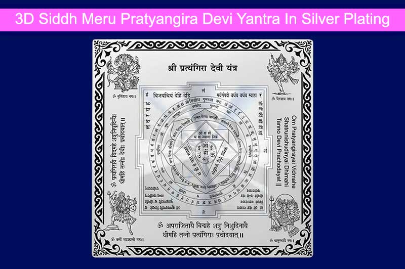 Worshipping 3D Siddh Meru Pratyangira Devi Yantra on Double Lotus is beneficial for protects the devotees against all odds and guides him/ her along the right path. Presence of this divine yantra help to eliminate the influences of evil forces. It also gives liberation and devotional service. Pratyangira Devi Yantra is a very powerful yantra for destroying negative karmas and removing black magic. It enhances the will power, self-confidence and self-esteem. The yantra products are delivered to the customers after proper energization & pran pratishtha. Therefore all the devotees are requested to forward their date, time & place of birth while ordering Yantra, so that the proper energization & pran pratishtha could be done on their names before the dispatch of the product.