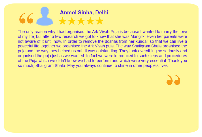 Ark Vivah Puja performed for the male having Manglik Dosh or 2nd Marriage Yoga in his horoscope. Performing this ritual leads a happy & satisfied life without any hurdles caused by the malefic effects of the planet. Shaligram Shala Online Puja & Yanga Services, the most trusted brand for online Hindu pujas and yajna services provider perform Ark Vivah puja rituals in India and other parts of the world such as UK, USA, Japan, Europe, Canada, Australia, Malaysia, Singapore, New Zealand etc.
