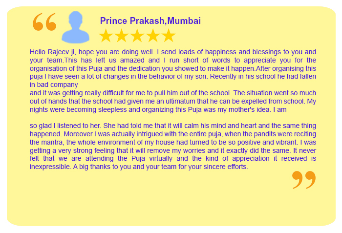 Each Puja Sankalpa has been taken elaborately by Sh. Rajeev Krishna (founder of shaligram.com) in English and Hindi so that devotees amply clear that for what purpose the particular puja is being conducted. One instruction sheet is sent wherein all the instructions are written in detail which are the number of priests, number of chants, Sankalpa, mantra, etc. Mr Rajeev Krishna can be contacted at 9322646420 / 9322646421 for listening to the Sankalpa. He will also briefly discuss your horoscope and guide you in the best possible way.