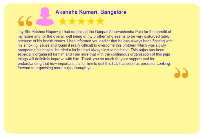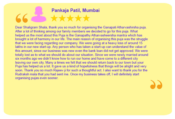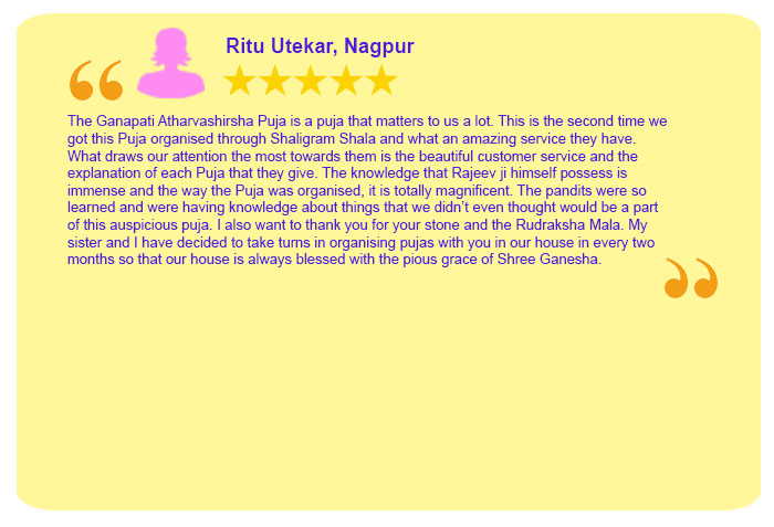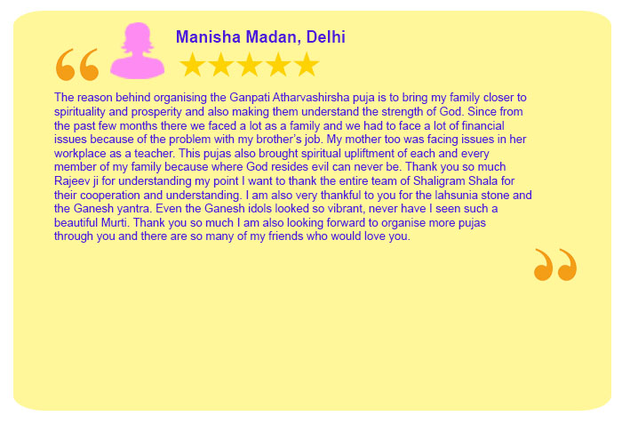 Each Puja Sankalpa has been taken elaborately by Sh. Rajeev Krishna (founder of shaligram.com) in English and Hindi so that devotees amply clear that for what purpose the particular puja is being conducted. One instruction sheet is sent wherein all the instructions are written in detail which are the number of priests, number of chants, Sankalpa, mantra, etc. Mr Rajeev Krishna can be contacted at 9322646420 / 9322646421 for listening to the Sankalpa. He will also briefly discuss your horoscope and guide you in the best possible way.