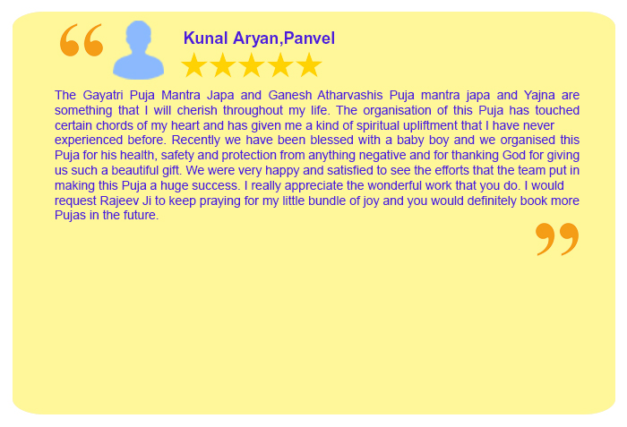 Gayatri Puja Mantra Japa and Ganesh Atharvashis Puja mantra japa and Yajna by Shaligram Shala Puja & Yagna Services includes Kalash Sthapana, Panchang Sthapana(Gauri Ganesh, Punyavachan, Shodash Matrika, Navgraha, Sarvotabhadra), 64 yogini Pujan, Shetrapal Pujan, Swasti Vachan, Sankalpa, Ganesh Pujan and Abhishek, Navgraha Pujan and 108 chants of each planetary mantra, Invocation of major Gods and Goddesses in Kalash, Yantra Puja, chants of Mantra, Havan, Aarti, Pushpaanjali and Brahmin Bhojan.