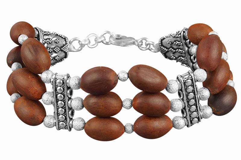 4) Lotus Seed Bracelet with Triple Layer - Lotus seed bracelets that have three layers of almost equal-sized Kamal seeds look stunning when paired with German silver jewellery that has ethnic motifs, an oxidised finish, and dazzling beads. The German Silver embellishments on the bracelets ends are designed differently than the other components. The bracelet is made into a fashion statement by the lovely ornaments that enhance its appearance.
