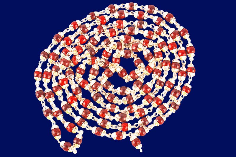 A variety of sandalwood Malas in single and triple strands, strung in various ways, are available at Shaligram Shala. We use real, all-natural sandalwood beads in many shapes and colors, including white and red. The Malas are hand-strung and can be purchased with or without embellishments. In addition, we have beautiful White and Red Sandalwood Bead Combination Malas in our inventory. Both casual and formal attire can be worn with the Chandan Malas. Each Mala is attached to elastic bands, silver chains, and adjustable strings. The Malas are expertly crafted.
