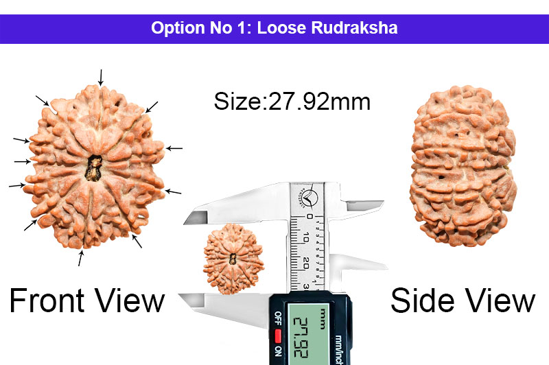 This Ekadasa Rudraksha connects the devotee with Harihara, Lord Shiva and Lord Vishnu. Hanuman is the greatest devotee of Lord Ram and this particular Rudraksha gives the blessings from both the Gods. This Rudraksha also blesses with all pleasures and happiness come to the man who worships Indra and makes him happy. It relieves the inmates from the fear of sudden death and thefts. This represents the 11th Rudra and the associated God of this Rudraksha is Lord Hanuman.