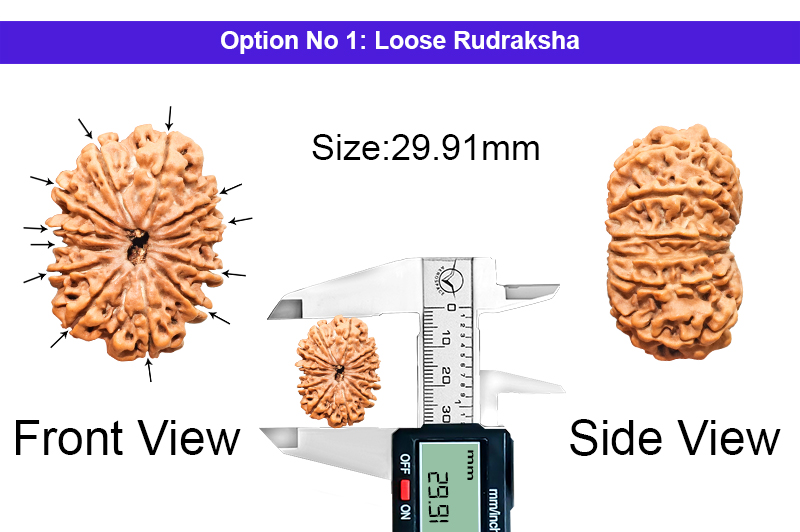 The 12 Mukhi Rudraksha bestows the inmates with immense dignity, respect, name and fame. This Rudraksha has a miraculous quality of extreme protection bestowed on the devotee and gives happiness and material gains and protection from sudden death and accidents. The Ruling Planet of 12 Mukhi Rudrakshas is Sun and it removes negativity, brings peace and the auspicious environment in the house and the workplace and protects the inmates from sudden accidents and thefts. It is also very good for the longevity of the inmates and controls Headache, Heart Disease, Skin Disease, Hiatus of Stomach and other related Problems. 12 Mukhi Rudraksha should be worn with 1 Mukhi, 3 Mukhi, 10 Mukhi, 14 Mukhi and 17 Mukhi Rudraksha to attain Dhyan yoga and Salvation and taking the business fame at the highest heights. This rudraksha balances Vishude, Manipurka and Swadisthana.