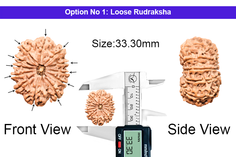 The 12 Mukhi Rudraksha bestows the inmates with immense dignity, respect, name and fame. This Rudraksha has a miraculous quality of extreme protection bestowed on the devotee and gives happiness and material gains and protection from sudden death and accidents. The Ruling Planet of 12 Mukhi Rudrakshas is Sun and it removes negativity, brings peace and the auspicious environment in the house and the workplace and protects the inmates from sudden accidents and thefts. It is also very good for the longevity of the inmates and controls Headache, Heart Disease, Skin Disease, Hiatus of Stomach and other related Problems. 12 Mukhi Rudraksha should be worn with 1 Mukhi, 3 Mukhi, 10 Mukhi, 14 Mukhi and 17 Mukhi Rudraksha to attain Dhyan yoga and Salvation and taking the business fame at the highest heights. This rudraksha balances Vishude, Manipurka and Swadisthana.