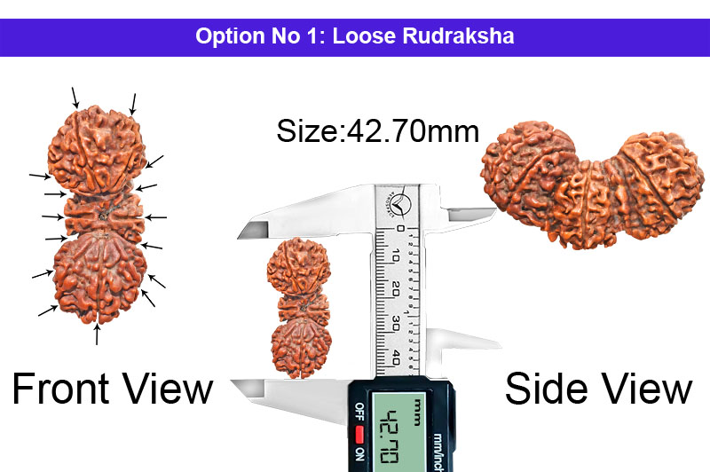 Three naturally joined Rudrakshas are a rare phenomenon of nature and such a bead is called "Tribhagi" or "Trijuti". This bead is also known as "Gauri Paath" and represents "Brahma Vishnu Mahesh" (The Trinity of God). In the Trijuti Rudraksha three beads individually represent Lord Brahma, Lord Vishnu and Lord Mahesh. It is very powerful to give universal appeal and empowers the wearer for great achievements, confidence and makes the wearer invincible. This bead blesses the devotee with tremendous Charisma, attraction and removes all hurdles to facilitate the path of success and contentment to the devotee.Trijuti Rudraksha Mantra