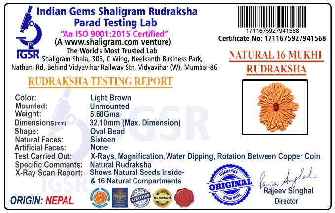 16 Mukhi rudraksha is also called as Maha Mrityunjaya Rudraksha as it represents Maha Mrityunjaya form of Lord Shiva. Maha Mrityunjaya Rudraksha rejuvenates, bestows the wearer good health and wealth, longevity, extreme protection from untimely death, sudden accidents and destroy all evil forces, black magic, occult and blesses the worshipper with contentment and very peaceful life. It is known since time memorial that meditating wearing 16 Mukhi Rudraksha connects one to pure consciousness and bliss. Earlier saints and Tapasvees used to wear this Rudraksha and do their Tapasya so that they are well protected from the natural calamities and attain Moksha in the least possible time. This Rudraksha also converts unfavourable times due to planetary imbalance in ones life to the most favourable times.