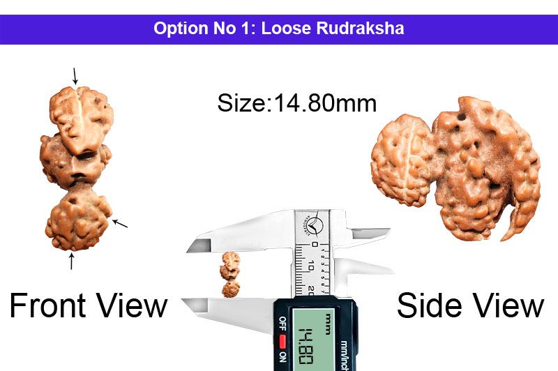 Three naturally joined Rudrakshas are a rare phenomenon of nature and such a bead is called "Tribhagi" or "Trijuti". This bead is also known as "Gauri Paath" and represents "Brahma Vishnu Mahesh" (The Trinity of God). In the Trijuti Rudraksha three beads individually represent Lord Brahma, Lord Vishnu and Lord Mahesh. It is very powerful to give universal appeal and empowers the wearer for great achievements, confidence and makes the wearer invincible. This bead blesses the devotee with tremendous Charisma, attraction and removes all hurdles to facilitate the path of success and contentment to the devotee.Trijuti Rudraksha Mantra